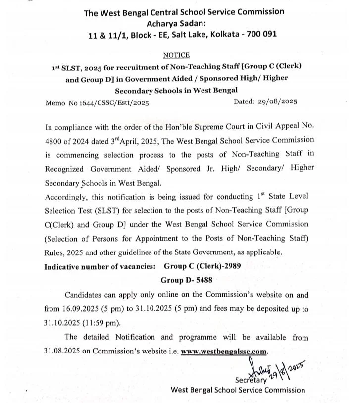 নতুন করে ওয়েস্ট বেঙ্গল স্কুল সার্ভিস কমিশনের মূলত মোট ৮৪৭৭ টি শূন্য পদে গ্রুপ সি ক্লার্ক এবং গ্রুপ ডির বেশ কিছু পরে কর্মী নিয়োগ করা হবে।